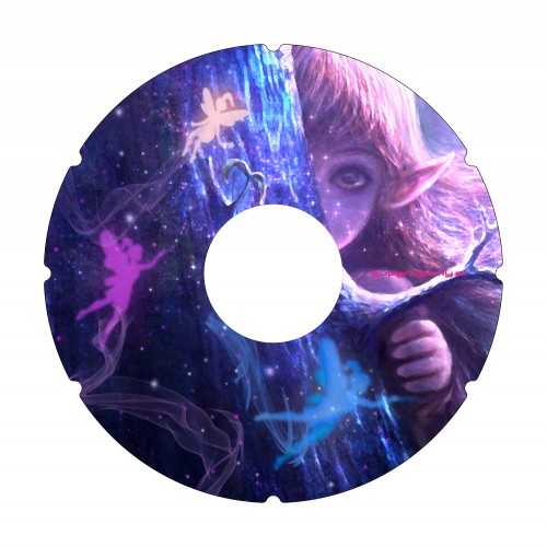 This magical graphic depicting a picturesque, fantasy world dominated by blue, purple, and black is perfect for bicycle spoke covers. This unique illustration captivates the eye and evokes a fairytale atmosphere, combining elements of nature with fantastical characters. Small, airy elves floating in the air, surrounded by a mysterious aura, bring a lightness and magical charm to the image. Their delicate silhouettes are woven into a background full of shadows and subtle colors, creating the impression that these creatures are a part of nature itself.